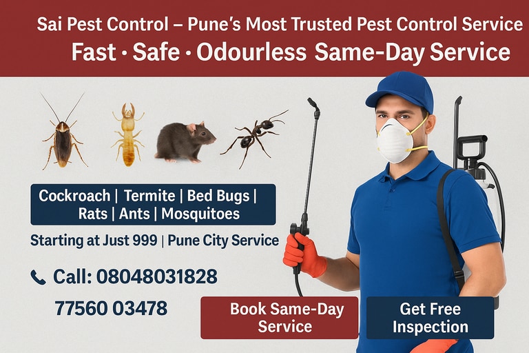 Sai Pest Control is one of the most trusted pest control companies in Pune, offering odourless, herbal, and 100% safe pest control services for homes, offices, societies, and commercial properties. With 15+ years of experience and a team of 10+ trained technicians, we provide same-day pest control service in Pune, including Warje, Hinjewadi, Baner, Pashan, Sus, Balewadi, Bavdhan, Kothrud, Aundh, and entire Pune City. We specialize in Cockroach C ... View More